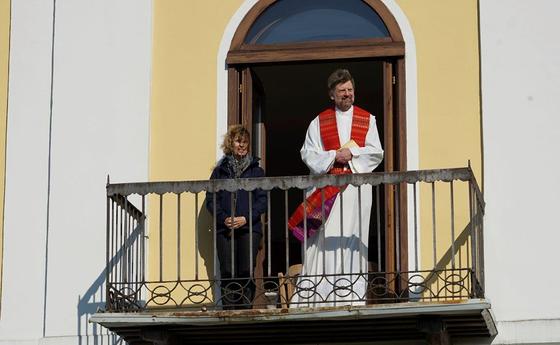 Um 9:15 segnete Pfarrer Sperker - nicht öffentlich - vom Balkon des Pfarrhofs aus die Palmbuschen der Pfarrmitglieder, die zu Hause gebunden wurden und von zu Hause aus mitfeierten.